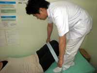 腰を浮かせてもらい、腰に矯正用枕を入れて行きます